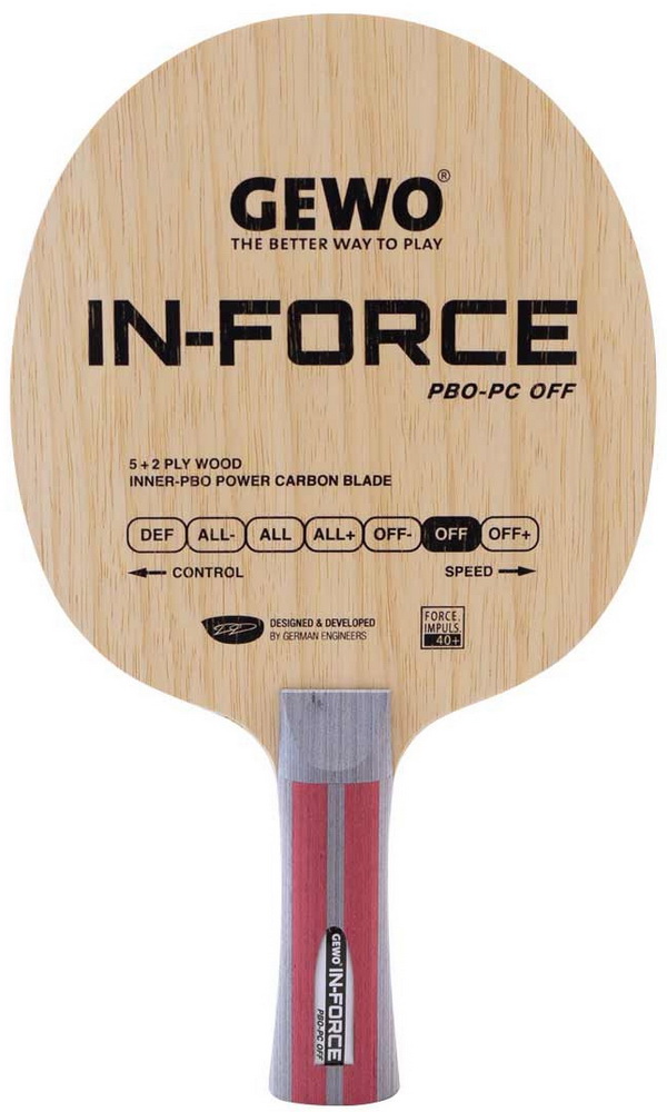 Neću prevoditi sve opise, već samo za Gewo In-Force PBO-PC, kao karakterističan. U drvu se, po prvi puta, koristi novi materijal “PBO-PC fibre”, koji drvu daje stabilnost, balans, “mekani osjećaj”, ali s dovoljno snage za jake udarce. Također, koristi se i nova tehnika lijepljenja. Završni sloj je furnir limbe, koji omogućava duži kontakt drva i loptice, te povećava rotaciju u spinu. Sastav: Limba – Limba – PBO-Power-Carbon – Ayous – PBO-Power-Carbon Limba – Limba. Težina: 84 87 g.