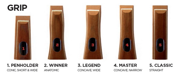 4. Prema vrsti drške drva se dijele na ona sa shakehand drškama i to sa ravnom, anatomskom i konkavnom drškom, pri čemu Stiga razlikuje 2 oblika takve drške: Master (užu) i Legend (širu), te na ona sa penhold drškom, pri čemu razlikujemo kinesku (drška kao shakehand konkavna, ali kraća) i japansku jednostranu i obostranu.